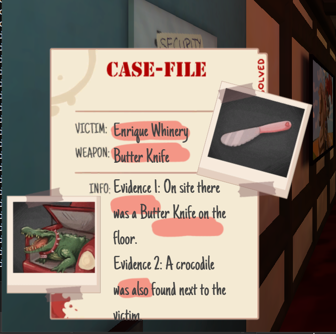 In addition to the objectives I also worked on the case files, which held information about the murder case. Each item consists of an visual element and some data to identify the murderer. The main challenge was to make sure that the player could collect enough clues to solve the case and ensure that the murderer has unique answers to the questions.